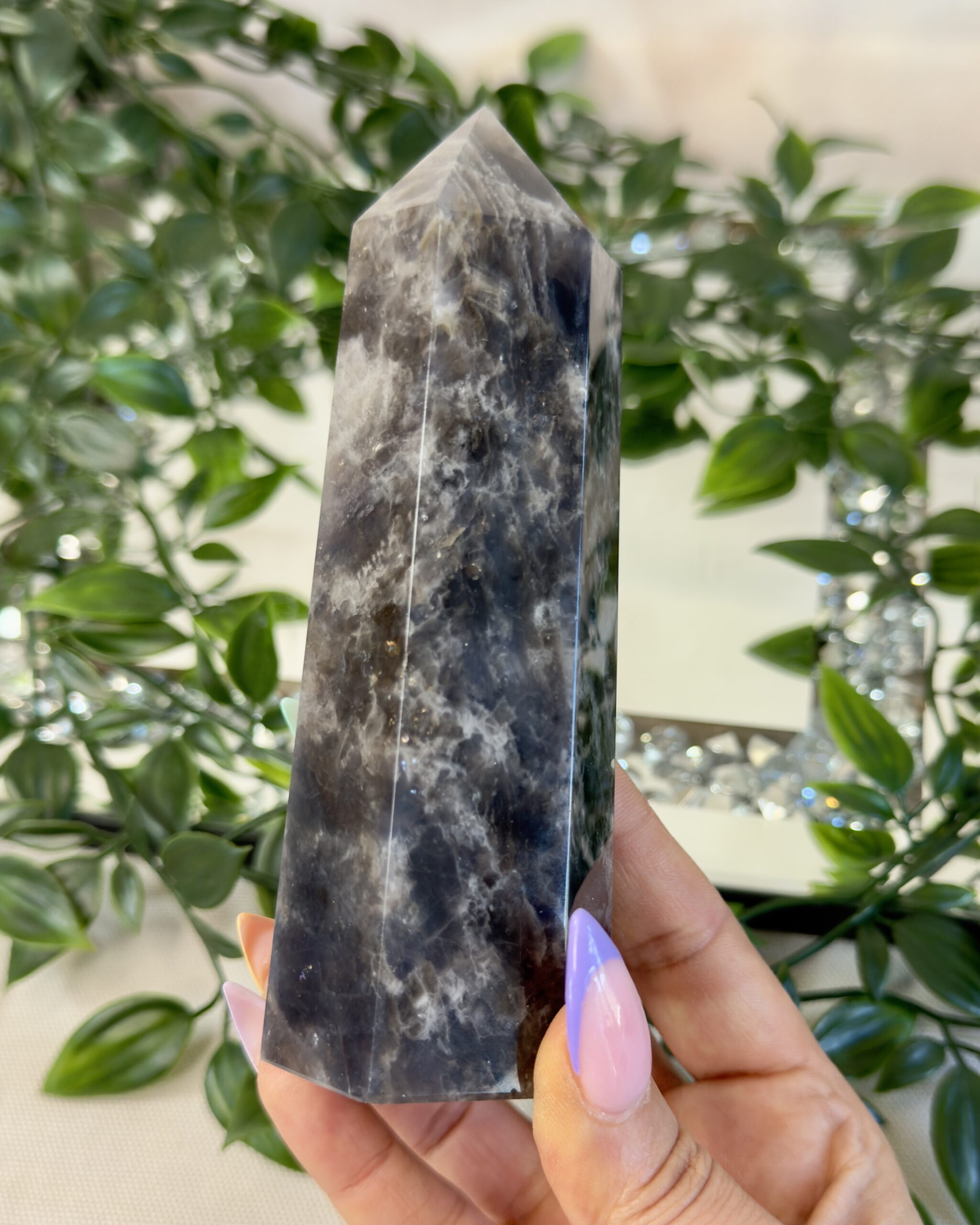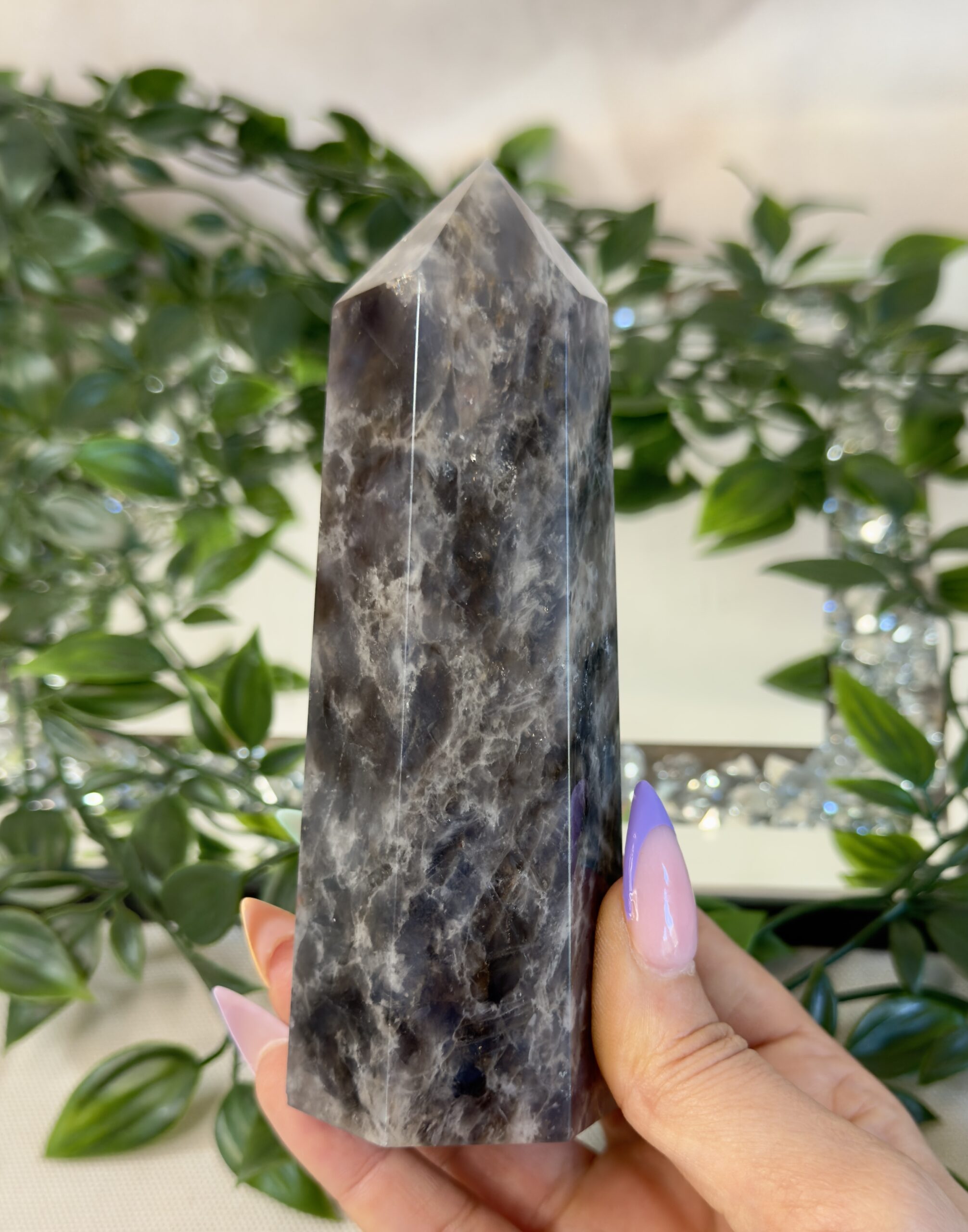 Stunning and powerful Black Rose Quartz tower with beautiful flashes and rainbows throughout.
