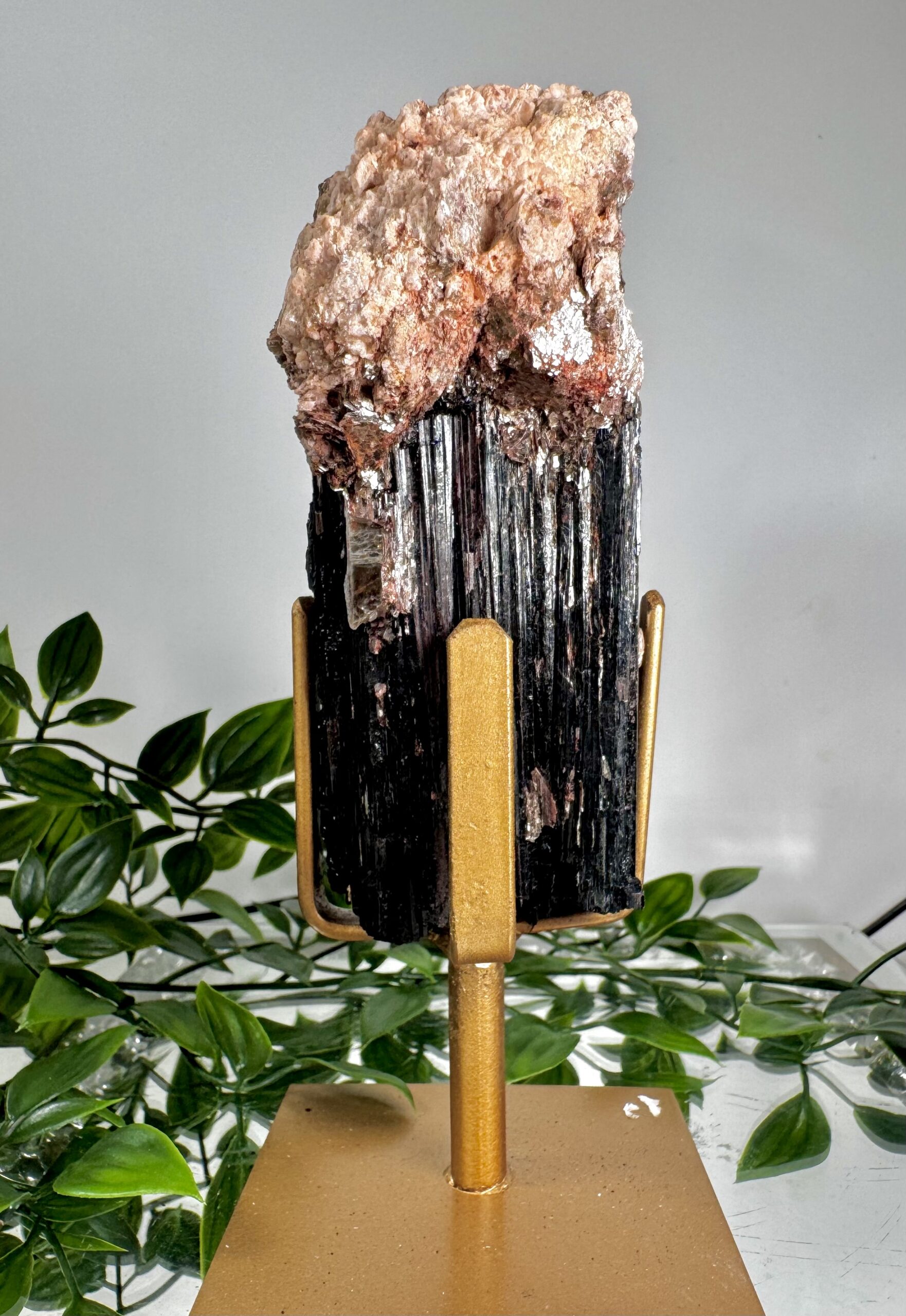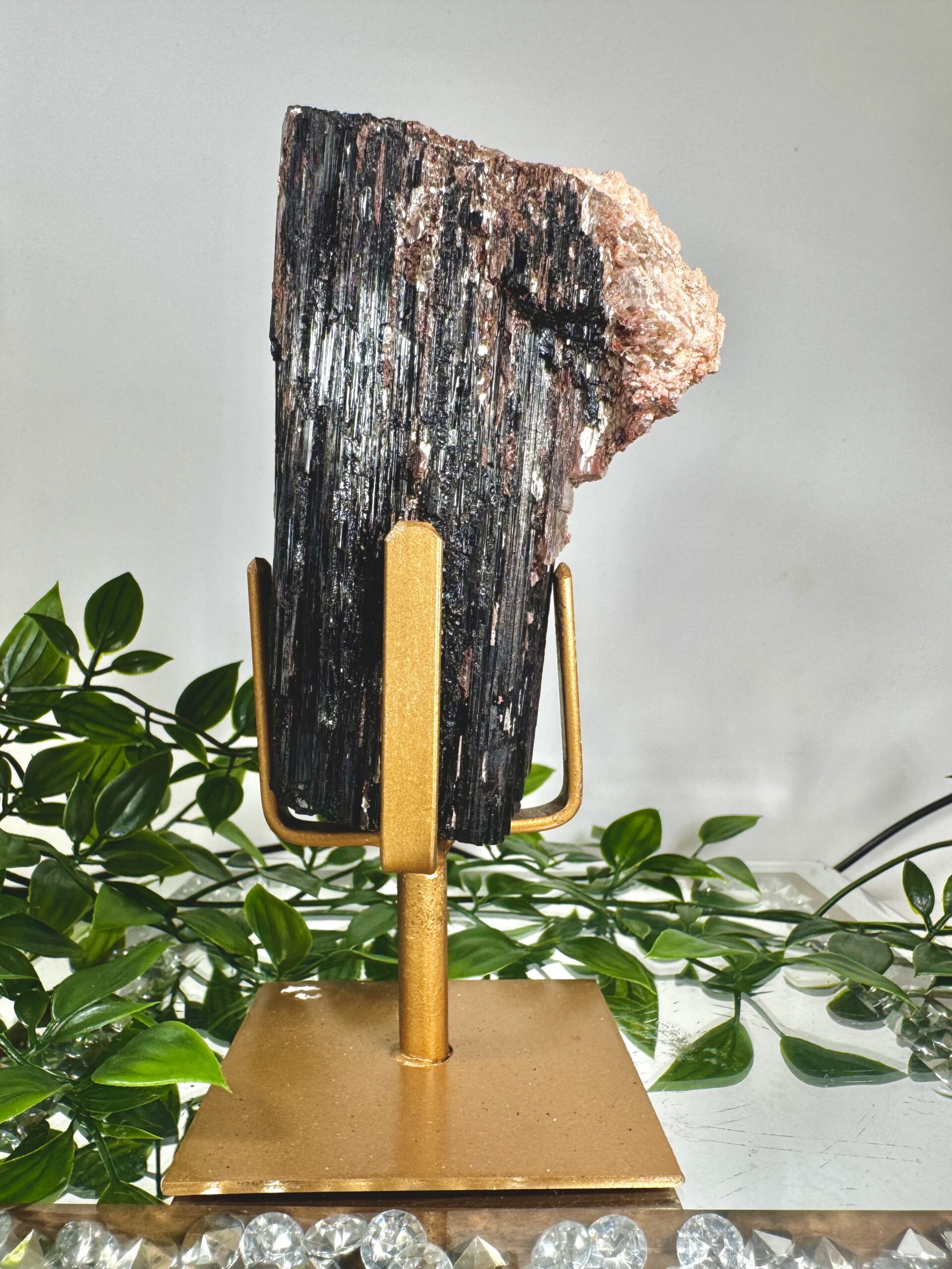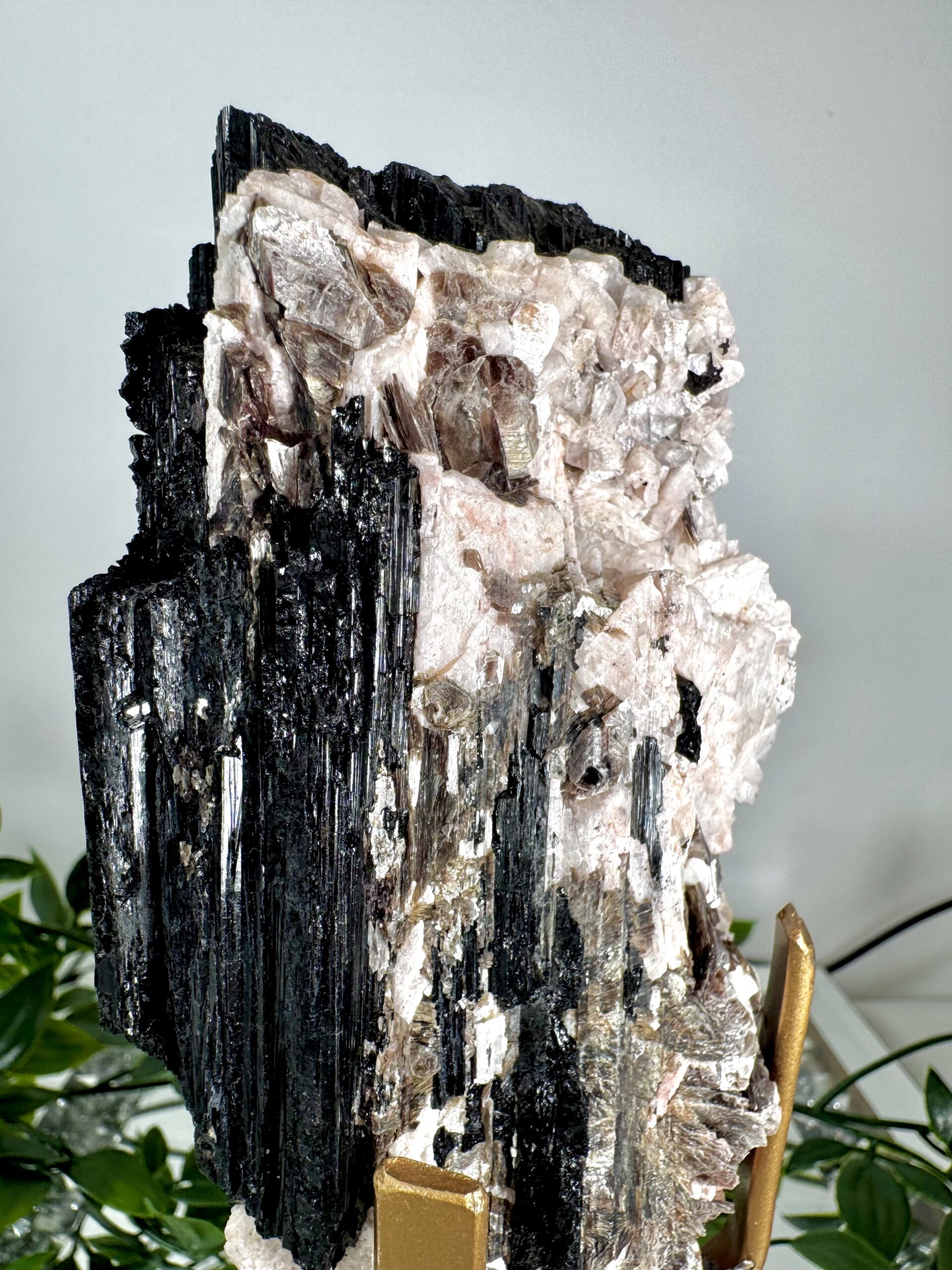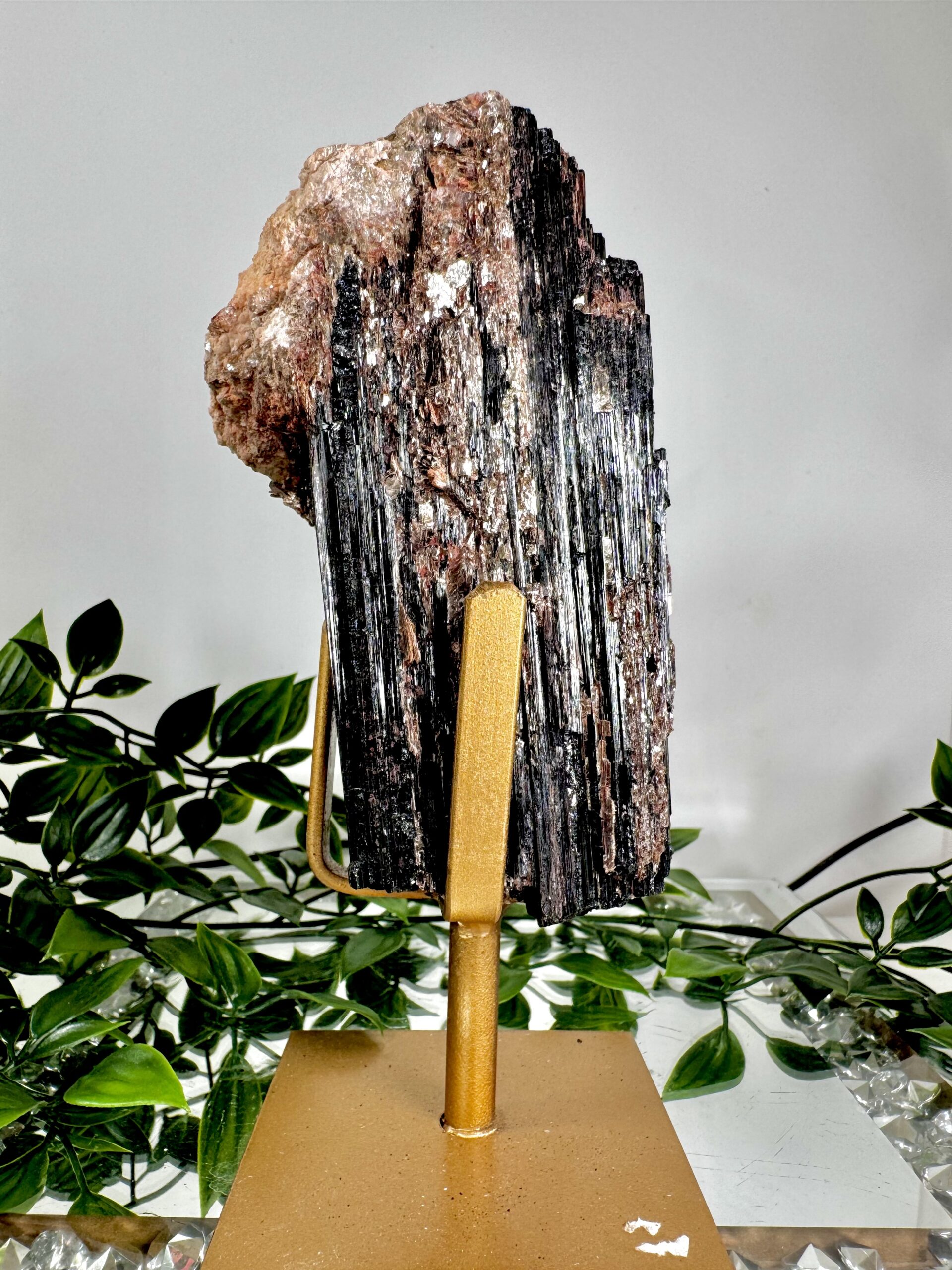 Stunning Brazilian raw Black Tourmaline on gold stands. Mixed with Golden Mica, red Hematite and Feldspar.