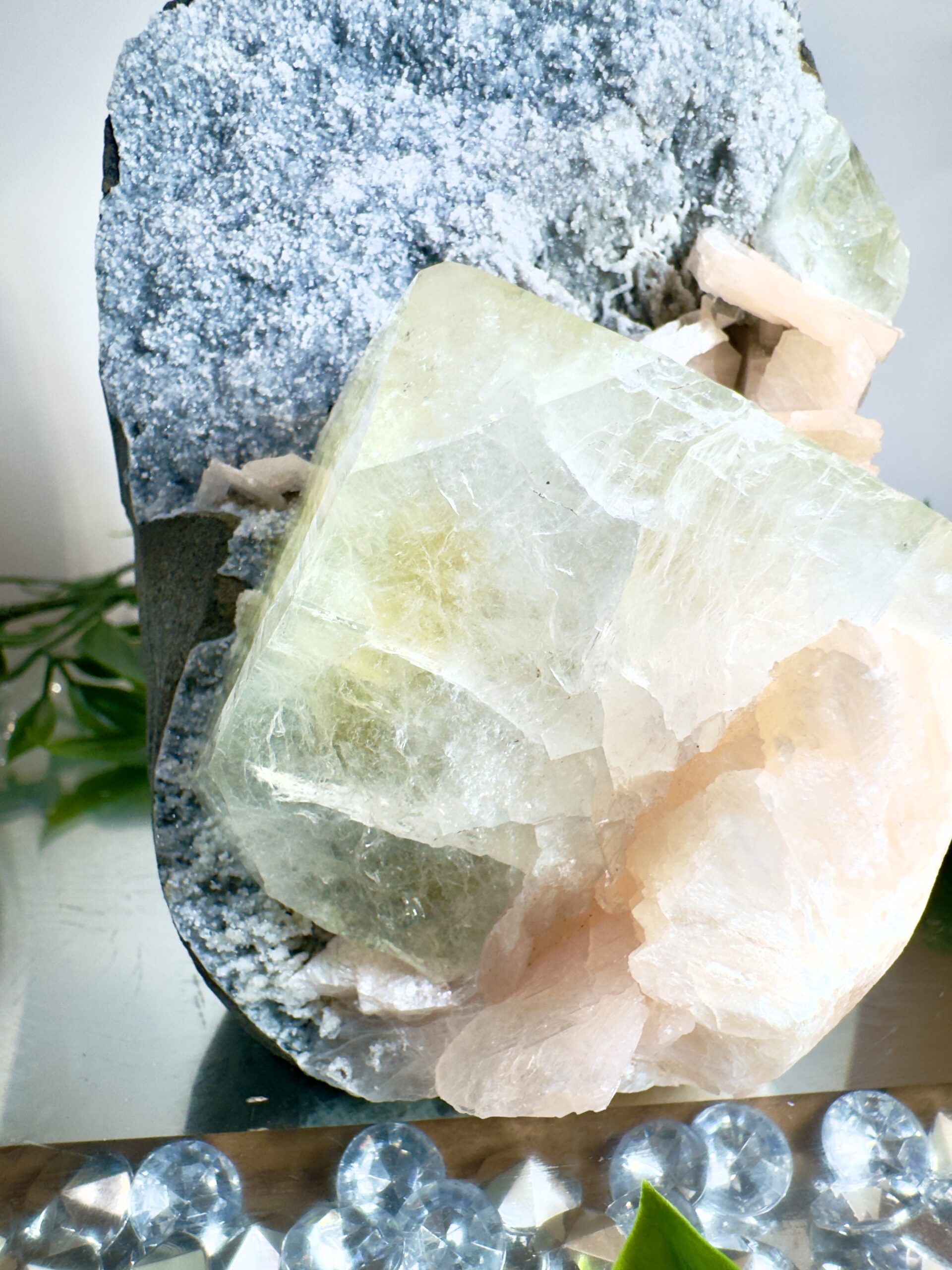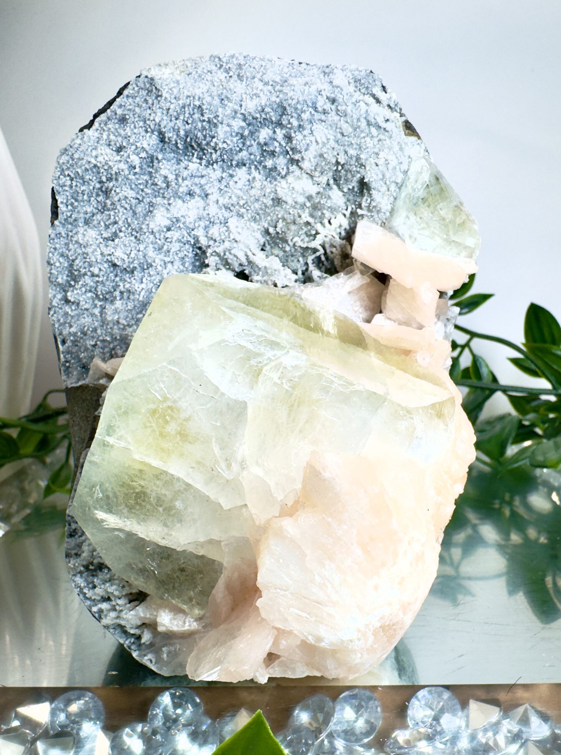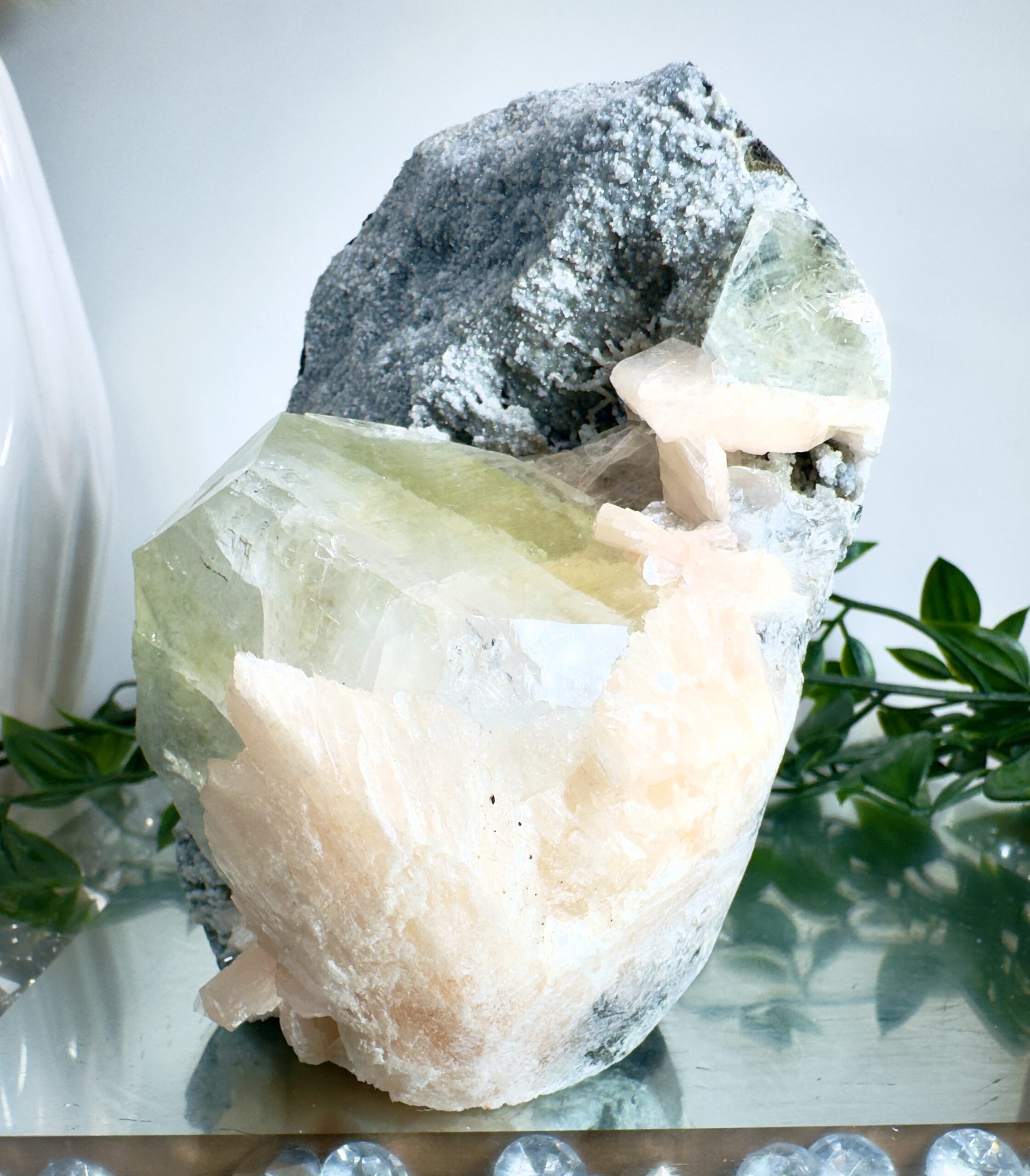 Beautiful Green Apophyllite & Peach Stilbite cluster from India. Gorgeous vibrant colours.