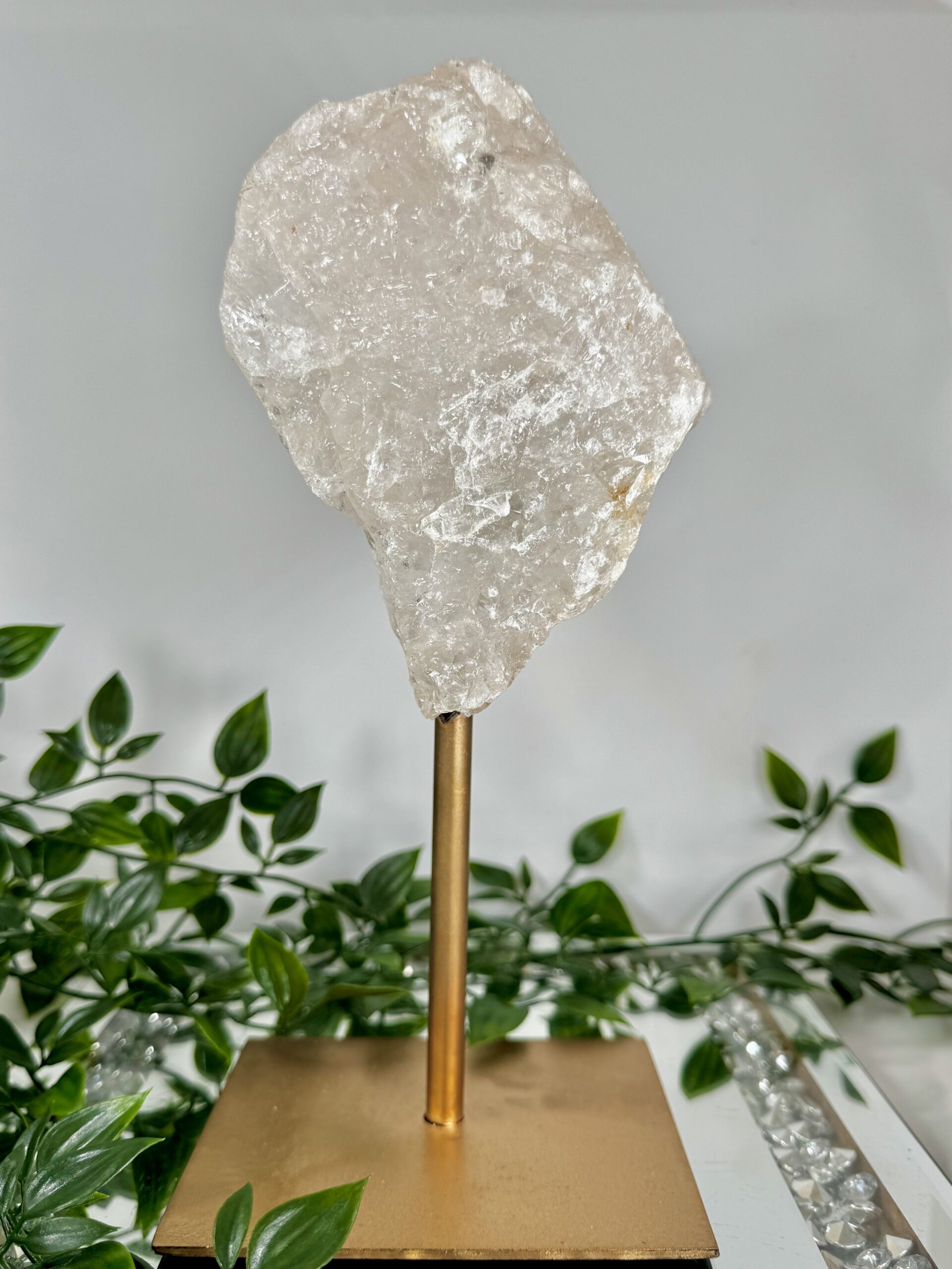 Beautiful raw Brazilian Clear Quartz on gold stand.